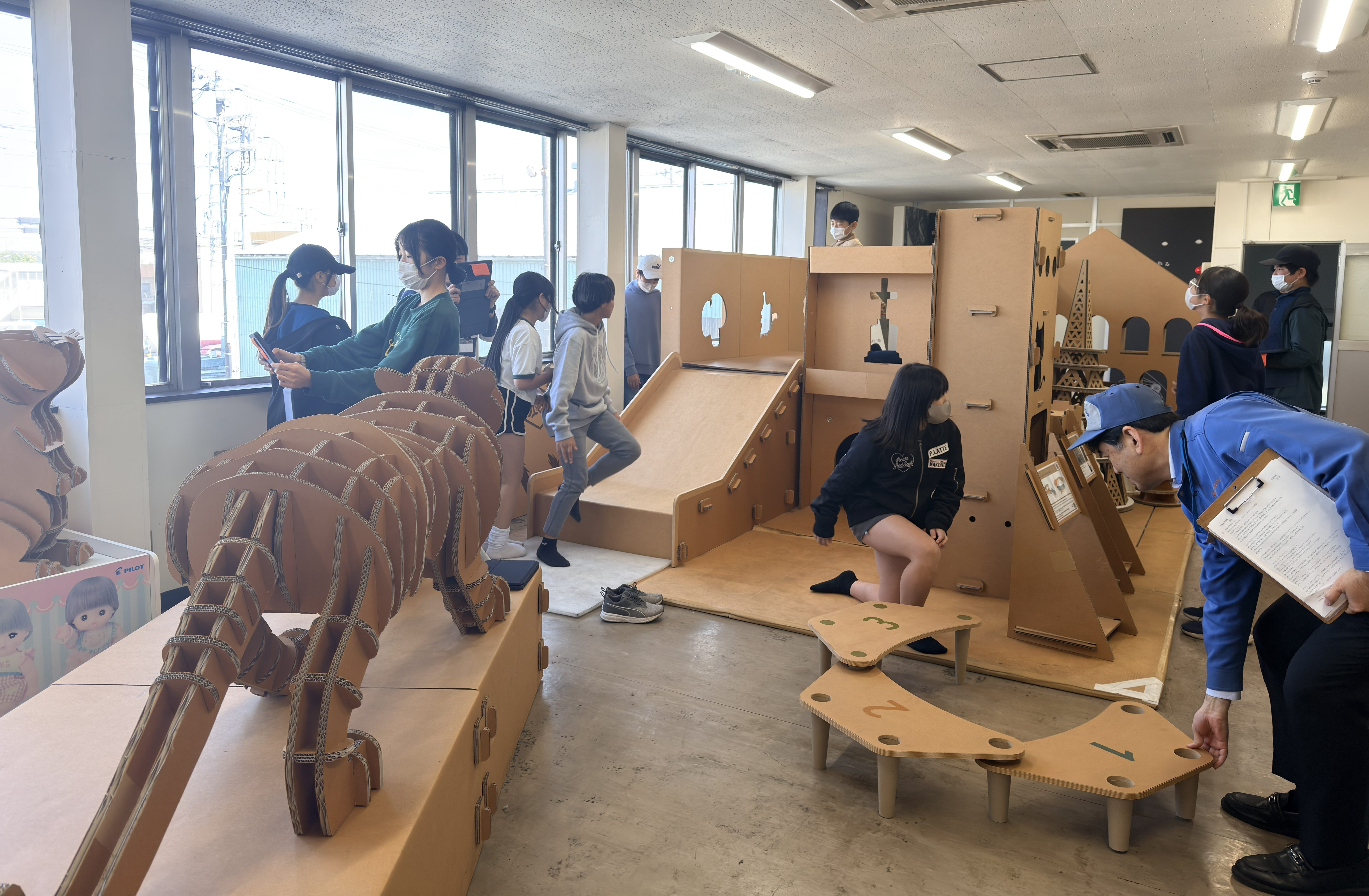 工場見学:原紙、加工・組立工程、作品ギャラリーを見学。触って/座って/乗ってOKの体験型で、終始キラキラの目線。